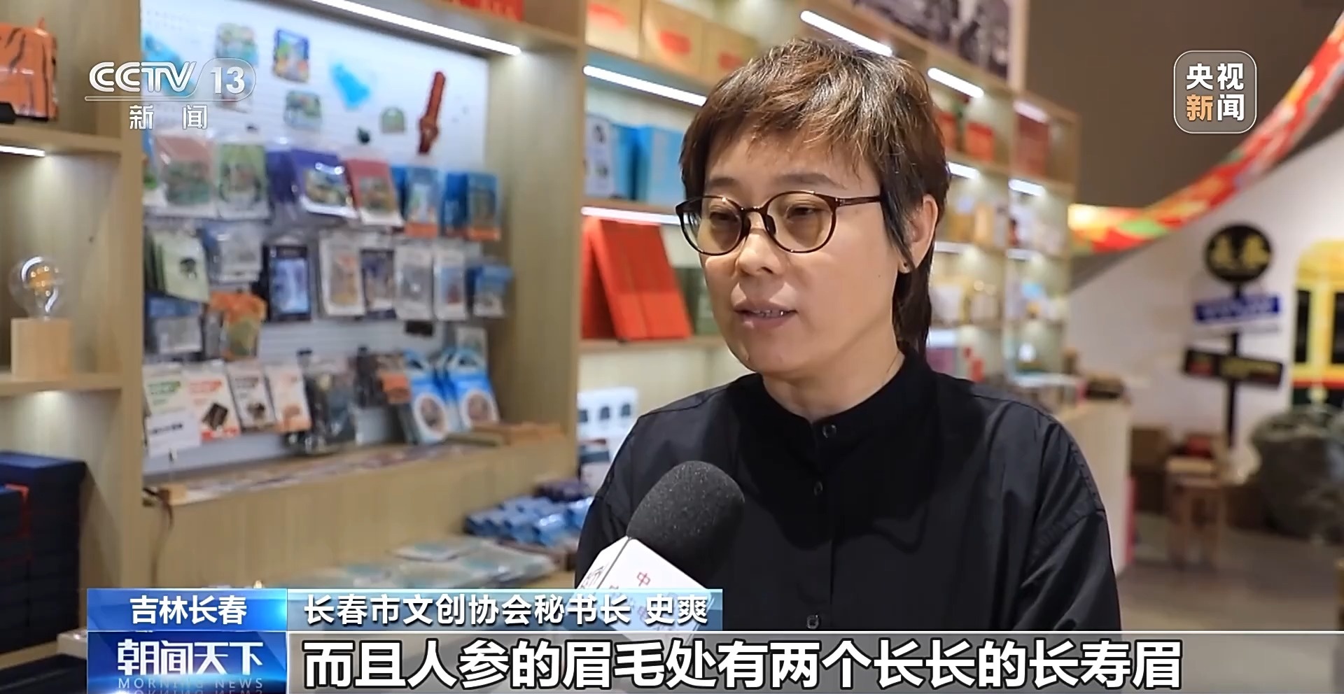 長(zhǎng)春市文創(chuàng)協(xié)會(huì)秘書長(zhǎng) 史爽:因?yàn)槲覀兗质∈侨藚⒌闹饕a(chǎn)地,上面的紅圍脖結(jié)合了我們?cè)械娜藚⒌涔剩导t繩的這樣的一個(gè)典故,而且人參的這眉毛處有兩條長(zhǎng)長(zhǎng)的長(zhǎng)壽眉,象征著吉祥如意。