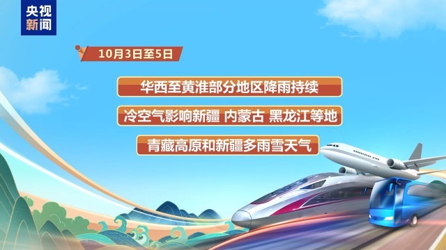 據(jù)中央氣象臺發(fā)布的消息,10月3日至5日,華西至黃淮一帶部分地區(qū)降雨持續(xù),冷空氣影響我國新疆、內(nèi)蒙古、黑龍江等地,青藏高原和新疆多雨雪天氣。公安部交通管理局提醒廣大駕駛?cè)撕统鲂腥罕,注意關(guān)注沿途及目的地氣象部門預報預警信息。