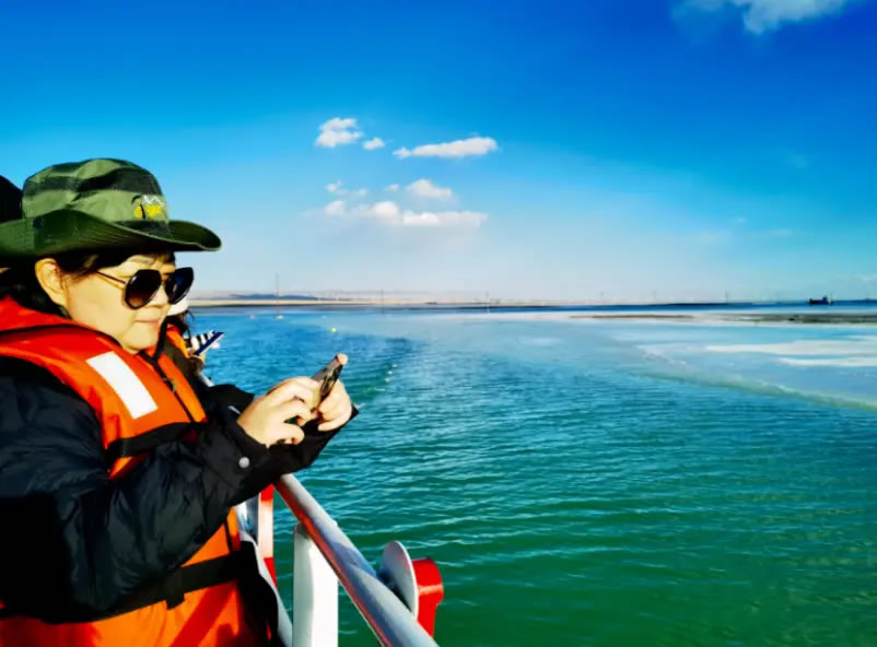 10月14日,由中共海西州委宣傳部主辦、西海都市報社承辦的“紅杞風光別樣美 ”活動,走進海西蒙古族藏族自治州烏蘭縣,研學團隊來到茶卡鹽湖,乘坐游船觀光,湖面上駛來的大型運鹽船讓外省記者及學生不由感嘆:沒想到“天空之鏡”還有另外一種獨特景致。湖面上駛來的大型運鹽船吸引了研學團隊成員的目光。采鹽船正在鹵水中作業(yè),發(fā)出低沉的轟鳴,空氣中彌漫著咸潤的氣息。研學的同學通過實地觀察鹵水的蒸發(fā)、結晶過程,將課本上的地理、化學知識,與這片壯麗的現實場景融會貫通。