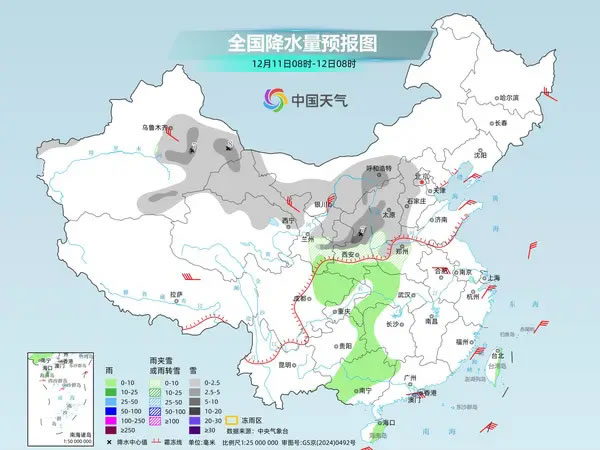 具體來(lái)看,今天,新疆沿天山地區(qū)和南疆盆地、西北地區(qū)中東部、內(nèi)蒙古西部、華北西部、黃淮西部等地部分地區(qū)有小到中雪或雨夾雪,其中,新疆沿天山地區(qū)和東部、陜西中北部等地部分地區(qū)有大雪。甘肅南部、陜西南部、湖北西部、湖南西部、四川盆地北部、重慶東南部、貴州東部、廣西大部、海南島、臺(tái)灣島等地部分地區(qū)有小雨。