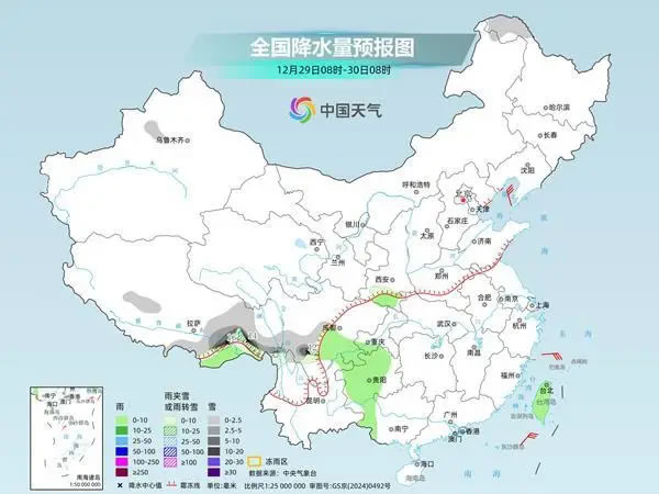 預(yù)計(jì)30日夜間開(kāi)始,隨著暖濕氣流增強(qiáng),西藏東部、四川、貴州、重慶、陜西南部、湖北西部等地降水又會(huì)發(fā)展增多。之后,水汽繼續(xù)向東、向北輸送,黃河以南地區(qū)將出現(xiàn)一輪“跨年”降水。目前來(lái)看這輪降水范圍廣,但強(qiáng)度不大,多是小到中雨雪量級(jí)。公眾需密切關(guān)注臨近預(yù)報(bào),做好相關(guān)防范措施。