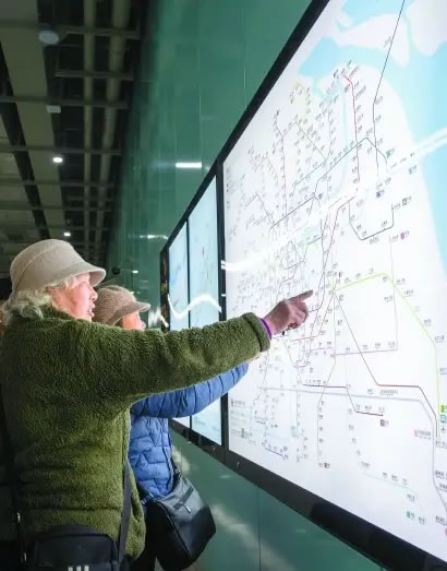 18號(hào)線二期工程開(kāi)通初期運(yùn)營(yíng)。一早,市民在康文路站內(nèi)了解上海軌交最新運(yùn)營(yíng)網(wǎng)線圖。記者 孟雨涵 攝
