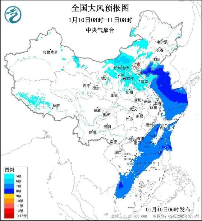 預(yù)計(jì),1月10日08時(shí)至11日08時(shí),西藏西部、甘肅北部、內(nèi)蒙古中東部、陜西北部、華北、山東、遼東半島等地部分地區(qū)有5~6級(jí)大風(fēng)、陣風(fēng)7~9級(jí);渤海、渤海海峽、黃海大部海域、東海大部海域、臺(tái)灣海峽、臺(tái)灣以東洋面、巴士海峽、南海東北部和中部海域、南海西南部海域?qū)⒂?~8級(jí)、陣風(fēng)9~10級(jí)的大風(fēng)。