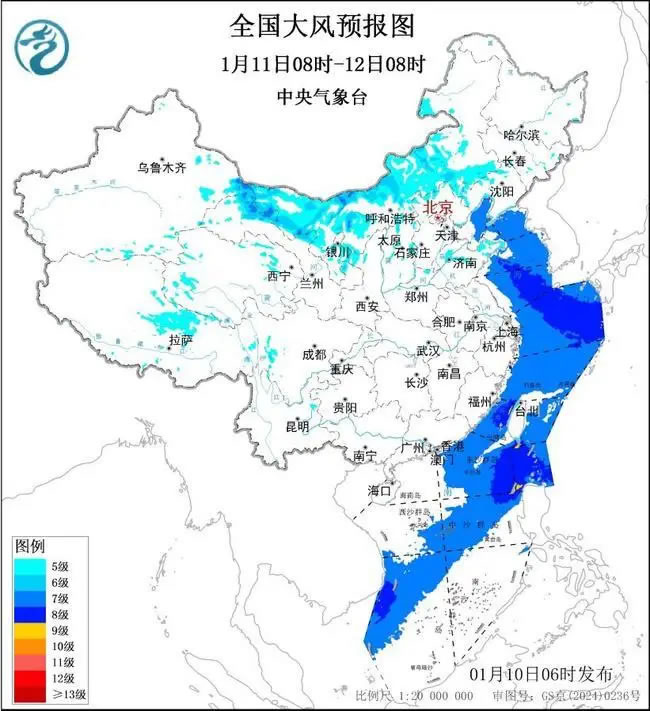 1月11日08時(shí)至12日08時(shí),西藏中部、甘肅北部、內(nèi)蒙古中西部、寧夏北部、陜西西部、山西北部、河北北部、山東半島、遼東半島等地部分地區(qū)有5~7級(jí)大風(fēng)、陣風(fēng)8~9級(jí);渤海、渤海海峽、黃海大部海域、東海大部海域、臺(tái)灣海峽、臺(tái)灣以東洋面、巴士海峽、南海東北部和中部海域、南海西南部海域?qū)⒂?~8級(jí)、陣風(fēng)9~10級(jí)的大風(fēng),其中臺(tái)灣海峽、巴士海峽、南海東北部的部分海域風(fēng)力可達(dá)9級(jí)、陣風(fēng)10~11級(jí)。