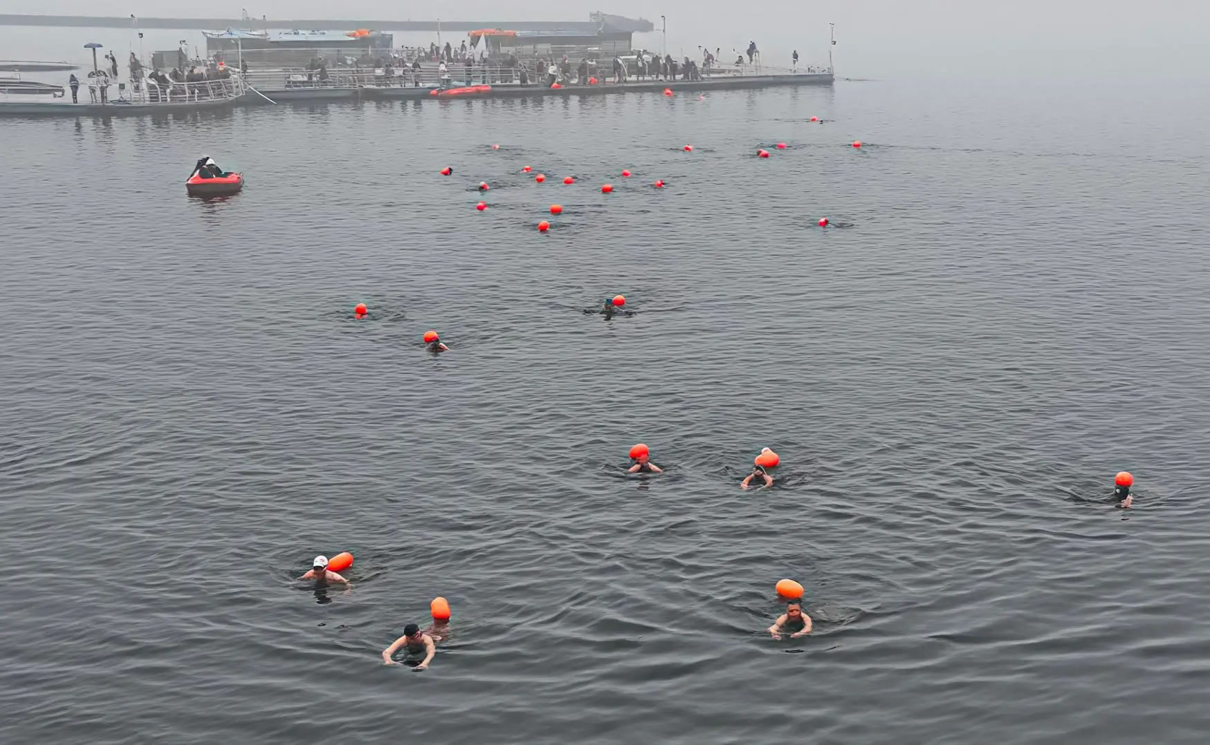 當(dāng)日9時(shí),比賽正式開始,隨著發(fā)令槍響,“泳士”們縱身躍入湖水。選手們或側(cè)泳疾馳,或蛙泳穩(wěn)進(jìn),凜冽寒風(fēng)絲毫未減他們的競(jìng)逐熱情。岸邊觀眾的吶喊聲、助威聲此起彼伏。