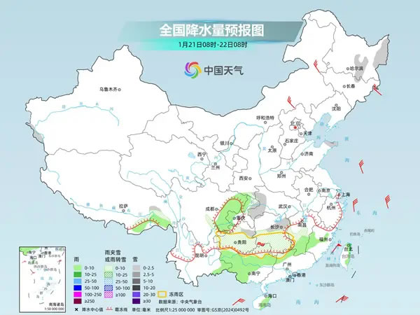 中國天氣網(wǎng)訊 今天(1月21日),南方雨雪繼續(xù)減少、減弱,但湖南、貴州等地部分地區(qū)仍有凍雨,需注意防范。明后天,中東部大部將進入雨雪間歇期。隨著寒潮和雨雪影響結(jié)束,后天起長江以南地區(qū)氣溫將陸續(xù)轉(zhuǎn)為偏高,但北方多地氣溫仍然低迷,需注意保暖。