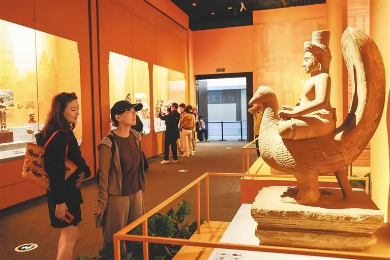 1月22日,觀眾在中國(guó)(海南)南海博物館里參觀“水與石的史詩(shī)——柬埔寨古代文明特展”。近日,由中國(guó)(海南)南海博物館、中國(guó)文物交流中心和柬埔寨國(guó)家博物館主辦的“水與石的史詩(shī)——柬埔寨古代文明特展”在中國(guó)(海南)南海博物館開(kāi)幕。該展展出來(lái)自柬埔寨國(guó)家博物館的石雕、陶器等122件(套)精美文物。(記者 張麗蕓)