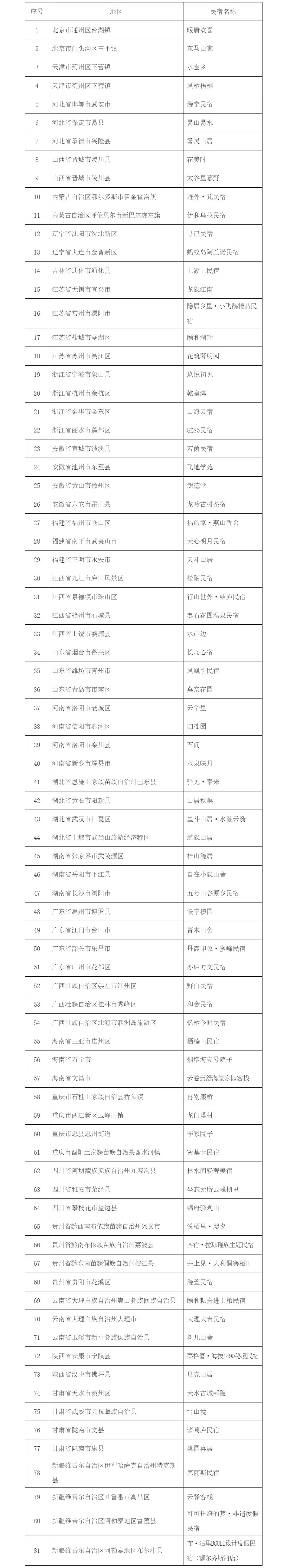 央廣網(wǎng)北京1月27日消息(記者 宋雪)據(jù)文化和旅游部網(wǎng)站消息,根據(jù)《〈旅游民宿基本要求與等級劃分〉(GB/T 41648—2022)實施工作導(dǎo)則》,81家旅游民宿符合全國甲級旅游民宿標(biāo)準(zhǔn),104家旅游民宿符合全國乙級旅游民宿標(biāo)準(zhǔn)。