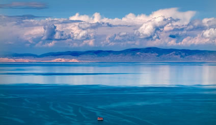 青海省青海湖景區(qū),位于青藏高原的東北部、西寧市西北部、剛察縣南部,距西寧市136公里。青海湖古稱“西!,又稱“仙!薄ⅰ磅r水!薄ⅰ氨昂糖己!保侵袊(guó)最大的內(nèi)陸湖、最大的咸水湖。湖面海拔3196米,湖岸線長(zhǎng)360公里,面積4583平方公里,湖水冰冷且鹽份很高。湖中有海心山,四周高山環(huán)繞:北面是大通山,東面為日月山,南面是青海南山,西面為橡皮山。湖區(qū)盛夏時(shí)節(jié)平均氣溫僅15℃,為天然避暑勝地。
