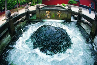 為濟(jì)南七十二名泉之一。位于百脈泉公園龍泉寺西南側(cè),泉池呈方形,漢白玉雕砌,正常年流量0.3立米/秒。泉孔黝深,水色蒼蒼如墨而得名。泉眼直徑0.4米,泉水騰涌而出,水清透明,泉水黝深,故名“墨泉”。墨泉水出自深部奧陶紀(jì)石灰?guī)r巖溶裂隙,盛水期泉流量0.5立方/秒,水柱沖出泉口,聲如雷鳴,雪濤飛濺。注入石渠,浩浩而下,有“一泉成河”的美譽(yù)。泉池前后刻“墨泉”二字,為大書法家舒同先生題寫。字體方正渾厚,“頗具魏晉飄逸之氣,含篆籀之義理,得分隸之謹(jǐn)嚴(yán)”,墨泉所在位置1966年-1980年曾是章丘縣委家屬住院,時任章丘縣委書記的舒同先生居此。