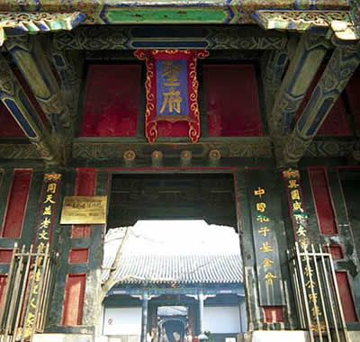 孔府位于曲阜城的中心,坐北朝南,迎面是一個(gè)粉白的大照壁,門(mén)前左右兩側(cè),有一對(duì)2米多高的圓雕雌雄石獅。紅邊黑漆的大門(mén)上鑲嵌著狻猊鋪首,大門(mén)正中上方的高懸著藍(lán)底金字的“圣府”匾額,門(mén)兩旁明柱上,懸掛著一對(duì)藍(lán)底金字對(duì)聯(lián):與國(guó)咸休安富尊榮公府第,同天并老文章道德圣人家。這副對(duì)聯(lián)相傳是清人紀(jì)均的手書(shū)。文佳字美,形象地說(shuō)明了孔府在封建社會(huì)中的顯赫地位。這副對(duì)聯(lián)口氣之大自不待言,發(fā)人深思的是上聯(lián)“安富尊榮”的富字,下聯(lián)“文章道德”的章字,從上圖可以看出,“富”字上少了一 點(diǎn),“章”字中多了一筆,意思是說(shuō)衍圣公官職位列一品,田地萬(wàn) 畝千頃,自然富貴沒(méi)了頂;孔子及其學(xué)說(shuō)“德侔天地、道冠古今”,圣人之家的“禮樂(lè)法度”,也就能天地并存,日月同光。