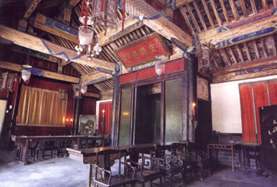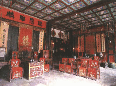 貪壁正北迎面就是正廳7間,名叫前上房。這是孔府主人接待至親和近支族人的客廳,也是他們舉行家宴和婚喪儀式的主要場(chǎng)所。院內(nèi)東西兩側(cè)各有一株茂盛的十里香樹(shù),每當(dāng)春夏相交時(shí)節(jié),潔白的花朵散發(fā)出陣陣清香,房前有一大月臺(tái),四角放著四個(gè)帶鼻的石鼓,是當(dāng)年府內(nèi)戲班唱戲時(shí)扎棚的腳石。清末孔府養(yǎng)著幾十人的戲班子,主人一聲令下,馬上開(kāi)鑼唱戲。 前上房?jī)?nèi),明間敞亮,正中高懸“宏開(kāi)慈宇”的大匾,中堂之上,掛有一幅慈禧親筆寫(xiě)的“壽”字。