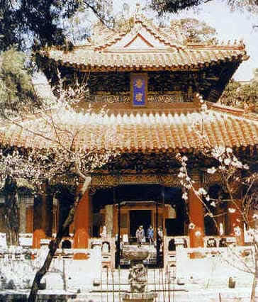 從杏壇北望,在雙層石欄的臺(tái)基上一座金黃色的大殿突兀凌空,雙重飛檐中海蘭色的豎匾上木刻貼金的群龍緊緊團(tuán)護(hù)著3個(gè)金色大字“大成殿”。字徑1米,是清雍正皇帝的手書(shū)。