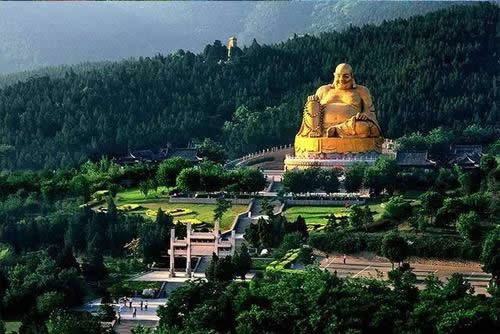 彌勒勝苑正門的牌坊高9.9米,寬12.5米,為四柱三門沖天式,整體造型莊重博大,氣勢(shì)不凡。主佛像為大肚彌勒佛,佛像通體高20米,采用3mm銅板焊接而成,花崗石質(zhì)的蓮花寶座高約9米,直徑30米,號(hào)稱“江北第一大佛 ”。佛像周圍的巖壁,雕刻了十八羅漢。主佛像身后的環(huán)形山崖上,是彌勒佛的生平事跡介紹的大型浮雕,其長(zhǎng)36米,高3.5米,面積126平方米。