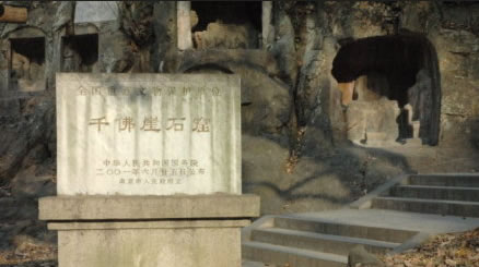 千佛崖位于禪寺院內(nèi)南側(cè),是濟(jì)南市較早的造像群,對(duì)研究我國(guó)隋代佛教,頗有價(jià)值。崖上,有隋開(kāi)皇七年(587年)至開(kāi)皇十五年(595年)所鐫刻的佛像,共9窟,計(jì)130多尊。極樂(lè)洞為造像群主窟,中間阿彌陀佛盤(pán)膝禪坐, 高3米,身后飾佛光。右側(cè)大勢(shì)至菩薩 ,左側(cè)觀世音菩薩侍立,高近3米,開(kāi)皇十一年(591年)鑿成。其他各窟皆散落在洞外石壁上。