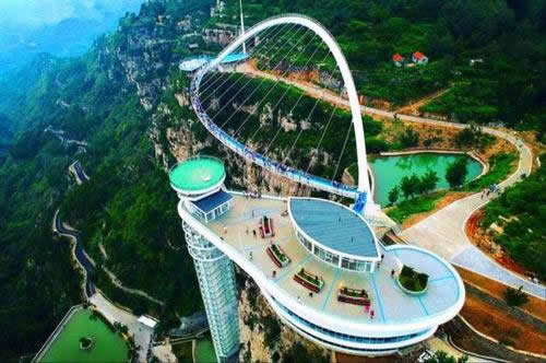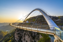 玻璃橋?yàn)闊o背索斜拉弧形玻璃橋,建于潭溪山海拔700米的崖壁之上,橋面跨度117米,懸空高度101米,外弧最大半徑90米,總承載可達(dá)900噸,單次承載10000人。玻璃橋整體由百米觀光電梯、懸崖酒店及玻璃橋體組成。其中,百米觀光電梯采用全景玻璃設(shè)計(jì),依懸崖而建,集觀光、代步、游覽為一體。橋體的彩虹狀獨(dú)特造型,充滿動(dòng)感與美感,且與山崖風(fēng)格渾然一體。潭溪山高空玻璃橋迄今為止,潭溪山高空玻璃橋已獲得兩項(xiàng)國(guó)際大獎(jiǎng):2019年世界結(jié)構(gòu)大獎(jiǎng)——行人橋梁獎(jiǎng),2020年國(guó)際橋梁大會(huì)(IBC)——亞瑟·海頓獎(jiǎng)。
