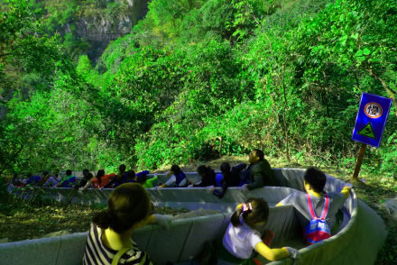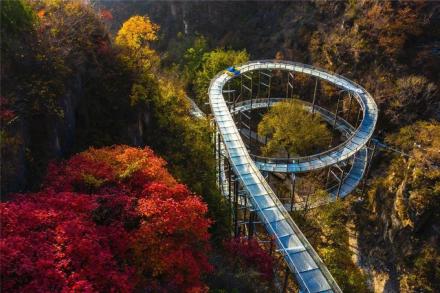 滑道自高門洞起,至空中玻璃漂流入口處止,長(zhǎng)約千米。此處山坡陡斜,樹木茂密,滑道從樹叢中順山勢(shì)蜿蜒而下,看似蟒行山間草叢中。其中有八個(gè)急彎,落差較大,乘坐滑道飛速?gòu)纳巾敾辽窖,驚險(xiǎn)刺激,樂趣無窮。