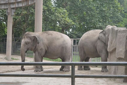 上海動物園飼養(yǎng)有國內(nèi)動物園少有的三代同堂的亞洲象家族。象展區(qū)包括象宮和象室外活動場兩部分。象宮建成于1955年,是上海動物園第一幢永久性的動物館舍,總建筑面積1550平方米,主要包括500平方米室內(nèi)活動場、620平方米參觀廳和100余平方米的4個門廳。室內(nèi)活動場的東、西、南三面都是寬9米的參觀廳,參觀廳進出口的門廳東、西各有一個,南面分左右二個,南面二門廳間外有紫藤棚架相連。整個建筑的門窗都用杉木拼雕成具有民族風(fēng)格的圖形裝飾。