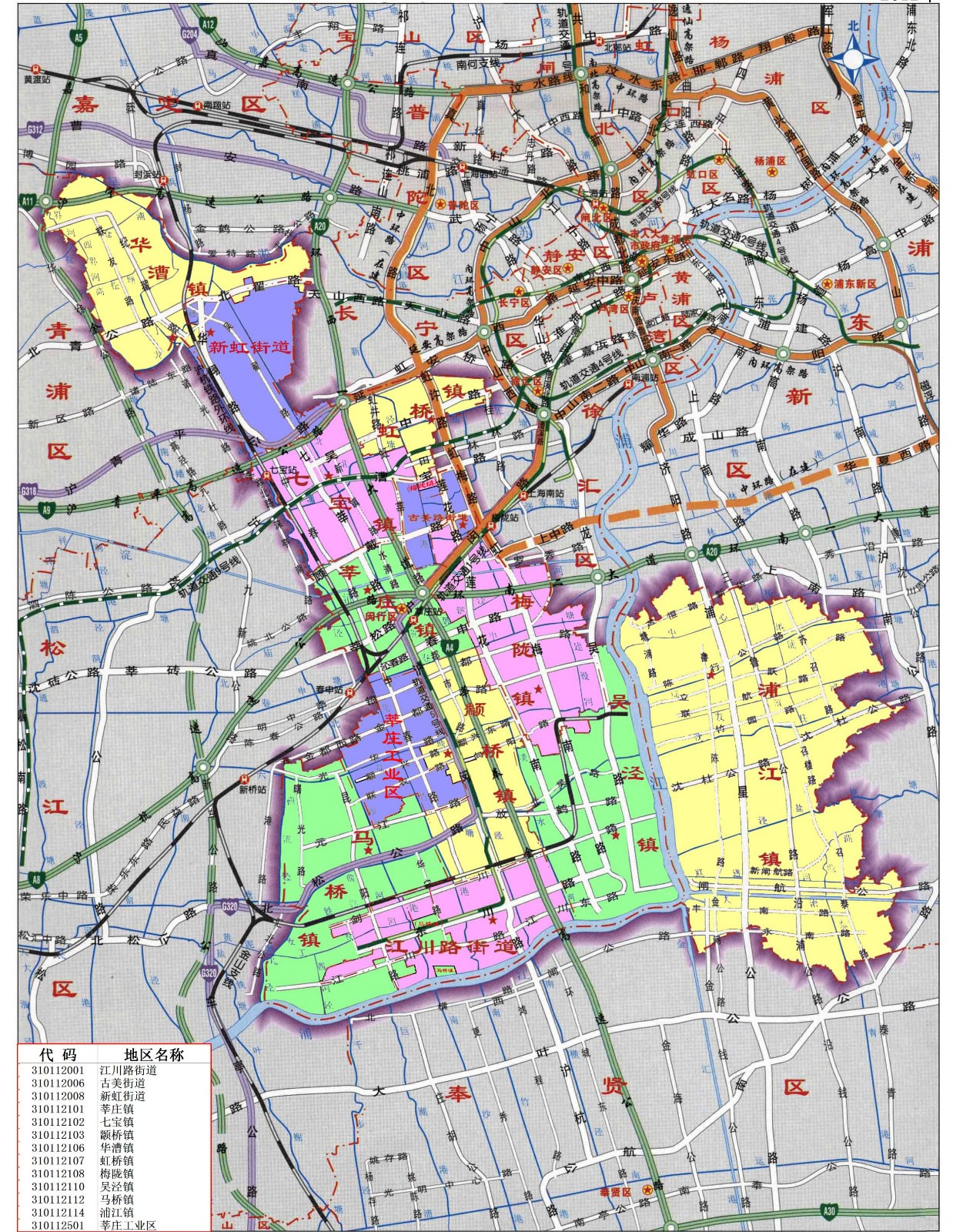 鎮(zhèn):莘莊鎮(zhèn)、七寶鎮(zhèn)、顓橋鎮(zhèn)、華漕鎮(zhèn)、虹橋鎮(zhèn)、梅隴鎮(zhèn)、吳涇鎮(zhèn)、馬橋鎮(zhèn)、浦江鎮(zhèn)