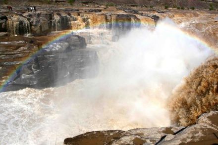 壺口瀑布反復(fù)沖擊所形成的水霧,升騰空中,使陽光發(fā)生折射而形成彩虹。彩虹有時(shí)呈弧形從天際插入水中,似長龍吸水;有時(shí)呈通直的彩帶橫在水面,象彩橋飛架,有時(shí)在濃煙騰霧中出現(xiàn)花團(tuán)錦簇,五光十色,飄忽不定,撲朔迷離,為天下奇觀。