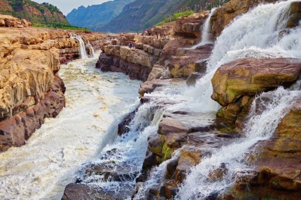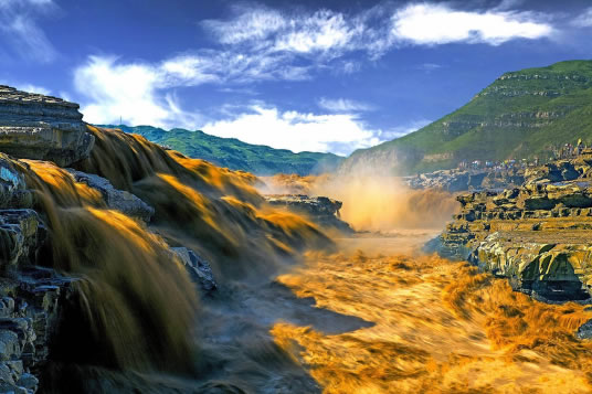 在高處河岸上,幾乎是看不到“龍槽”和黃河水流,只能看到紫褐色基巖河床中一線急騰翻卷的黃濁水塵和聽到轟鳴不息的奔騰濤聲。這槽中激流就象一鍋滾沸的水,左奔右奪,奔騰翻滾急下,激起的水霧彌漫在龍槽之上,使黃河在這里變得朦朦朧朧。每逢汛期黃河水漲時(shí),洪水溢出壺口龍槽一端,龍槽東岸會(huì)出現(xiàn)一道一、二千米長的漫流水簾,十分壯觀。遠(yuǎn)望龍槽,彎彎曲曲的峽中石槽,活象一條搖頭擺尾的巨龍,壺口是龍頭,一口吞沒黃河巨流。孟門是龍尾,腹泄河水于下游。