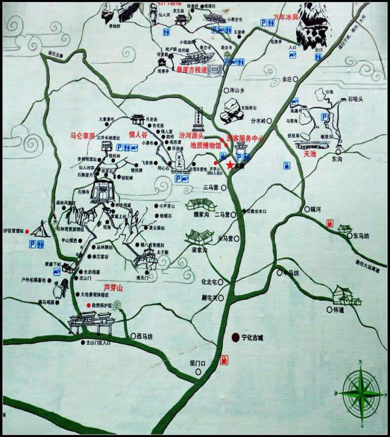 太原到寧武:太原太佳高速—豐潤口下—靜樂—東寨、太原—大運高速—忻州—忻保高速—蘆芽山口下—東寨、太原—頓村—分水嶺—東寨 [13]