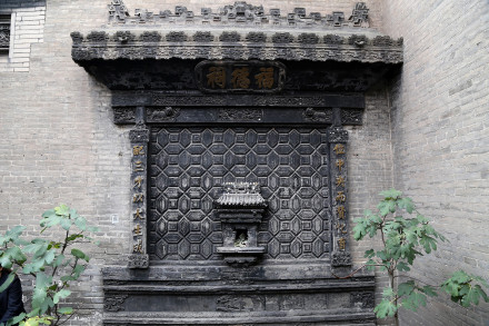 喬家大院大門坐西向東,為拱形門洞,上有高大的頂樓,頂樓正中懸掛著山西巡撫受慈禧太后面喻而贈(zèng)送的匾額,上書“福種瑯環(huán)”四個(gè)大字。黑漆大門扇上裝有一對椒圖獸街大銅環(huán),并鑲嵌著銅底板對聯(lián)一付:“子孫賢,族將大;兄弟睦,家之肥。”字里行間透露著喬在中堂主人的希望和追求,也許正是遵循這樣的治家之道,喬在中堂經(jīng)過連續(xù)幾代人的努力,達(dá)到了后來人丁興旺、家資萬貫的輝煌。大門頂端正中嵌青石一塊,上書“古風(fēng)”。大門對面的掩壁上,刻有磚雕“百壽圖”,一字一個(gè)樣,字字有風(fēng)采。百壽圖為“在中堂”主人喬致庸的孫婿、近代著名學(xué)者、篆書家常贊春書寫。掩壁兩旁是清朝大臣左宗棠題贈(zèng)的一付意味深長的篆體楹聯(lián):“損人欲以復(fù)天理,蓄道德而能文章!遍侯~是“履和”。甬道的西盡頭處是雕龍畫棟的喬氏祠堂,與大門遙相對應(yīng)。祠堂裝點(diǎn)得十分講究,三級臺階,廟宇結(jié)構(gòu),以獅子頭柱,漢白玉石雕,壽字扶欄,通天欞門木雕夾扇。出檐以四條柱子承頂,柱頭有玉樹交榮、蘭馨桂馥、藤羅繞松的鏤空木雕。額頭有匾,上書“仁周義溥”四字,李鴻章所題。祠堂里原陳列著木刻精雕的三層祖先牌位。