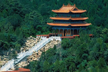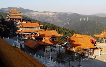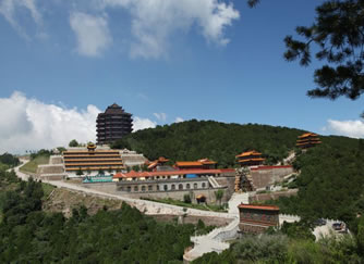 烏金山不僅有豐富的自然景致,而且還有數(shù)不盡的人文景觀。由于烏金山山高林密,氣候宜人,風(fēng)景秀美,靜謐清幽,歷朝歷代多有僧侶入山修行,更有文人墨客、達官顯貴前來觀瞻,因此便留下了許多人文遺跡。這里是佛教圣地五臺山的下院,曾被稱為文殊菩薩講經(jīng)的道場,于是便形成了以寺廟群落為主的諸多景觀。許多寺廟群都依山而建,金碧輝煌,氣勢恢弘。這些寺廟群大都分布在千頃碧綠的林海中。遠遠望去,就像茫茫綠海中時隱時現(xiàn)的海市蜃樓,顯得縹緲奇幻而又雄偉壯觀。
