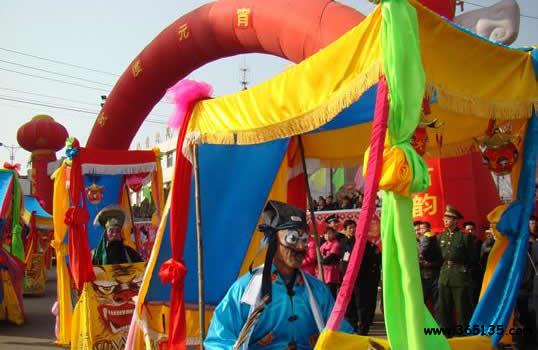 旱船:用竹條或木條制成船的模型,周?chē)酶魃什颊谏w。表演者每人一船。以歷史或現(xiàn)代劇目為內(nèi)容,表演時(shí),一人在船前劃船引導(dǎo),數(shù)人在后駕船,翩翩起舞,并變換各種隊(duì)形表演。東寨的旱船表演最為壯觀。