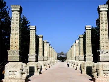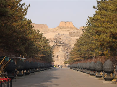 所謂禮佛大道:“恩澤普武周,慈航通法岸”。向西走去,十三對千佛列柱依次列于禮佛大道兩側。神柱高8.73米,系黃沙巖雕刻,由下而上依次為須彌座、力士、白象、柱體的完美組合,造型高聳、精致亙絕,在兩側濃密的松林掩映下,矗立的神柱氣勢雄偉、蔚為壯觀,仿佛通天入地,也仿佛唯有這樣的神柱鋪成的路才可以叫做禮佛大道。千佛列柱的原型在第9、10窟,第12窟,第14窟等處,均以大象、獅子等神物馱承,立體而又恢弘,呈現出平城時期北魏皇宮的恢弘模樣。