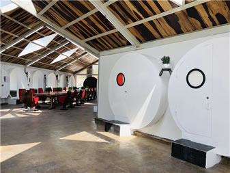 蝸牛公寓位于云岡石窟景區(qū)東山,是東山菩提藝術區(qū)的一部分,由云岡石窟研究院主導創(chuàng)意,用廢舊水泥管、廢舊鋼鐵等廢舊材料打造出來的綠色環(huán)保寫生建筑。走進“蝸牛公寓”,內含會客廳、28間臥室,洗漱臺、衛(wèi)生間,其中地下公共部分還配有電影放映室、臺球室、酒吧、咖啡廳等公共休閑娛樂設施,長廊的墻壁,藝術家或藝術院校學生可以隨意涂鴉。這個特別隨意且有藝術范兒的空間,為到云岡石窟景區(qū)寫生創(chuàng)作、旅游休閑的人們提供了優(yōu)質舒適的住宿、創(chuàng)作、娛樂空間。