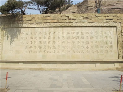 位于云岡石窟一窟山門前的“比丘尼曇媚造像記”石刻,為公元503年(景明四年)的題記。此碑刻有文字110個,再現了當時的社會背景,表達了發(fā)愿人比丘尼曇媚對佛教的高度信仰與虔誠以及希望佛教振興發(fā)展的愿望,文筆優(yōu)美,堪稱佛教發(fā)愿文之最。此碑也向我們展示了北魏時期一種特有的字體。因這種字體在當時多用于碑文,所以后人稱它為魏碑體。魏碑字體外方內圓、拙樸有力,是隸書向楷書過渡的字體。由此看來,魏碑書法應是北魏平城時的創(chuàng)造。原物很小,只有30厘米高,28厘米寬,于1956年20窟前考古發(fā)掘,現存于云岡博物館中。