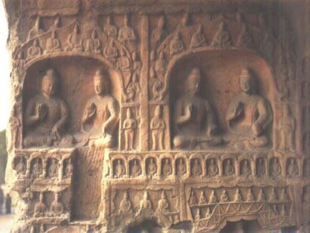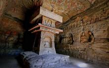 在風化殘破的第14窟中,正壁為一佛二菩薩主像,除下層龕像為晚期補刻外,中上層龕像大致有計劃雕鑿。后室東西壁分作三層:上層以盝形龕交腳菩薩為主體,內側有一小坐佛圓拱龕;中層為較大、較深的坐佛圓拱龕,龕外兩側為三層出檐閣樓塔;下層深龕仿佛雕刻了帷幔,東壁為坐佛,西壁龕內未完成即被改刻。整個洞窟設計嚴謹、雕刻精美。