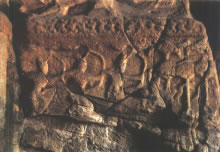 穿過神柱林立的佛光大道向西,呈現于世人眼前的是兩面相對的扇形皇家禮佛浮雕墻。這組正面相對的浮雕墻總體呈圓弧狀,長約20米、高約4米,畫面構圖完美,雕刻細致,以高浮雕的形式,生動表現了北魏皇家盛大的帝后禮佛圖。車轔轔、馬蕭蕭的現場氣氛,充分再現了北魏當時皇帝、皇后前往禮佛的莊嚴肅穆的宏大場面,這種場面讓人自然聯想到1500多年前云岡石窟作為皇家寺院曾經的輝煌,讓人舉目流連。