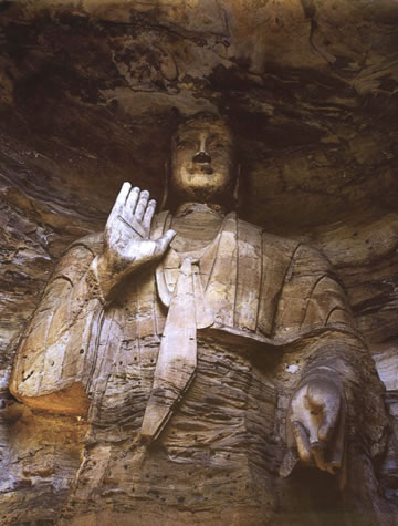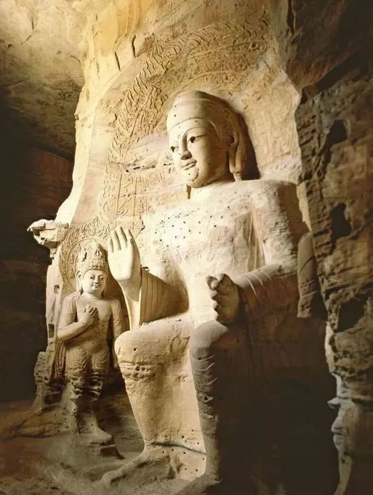 第19窟主佛像結跏趺坐,佛像耳輪齊肩,下頜崩毀,著袒右肩袈裟,輕薄貼體,衣紋簡潔明快。佛像右手舉胸施無畏印,左手掌心向上握法衣于膝上,以表達佛法的無畏與傳承?咄鈻|西耳洞中,各雕刻一尊倚坐佛像,西耳洞佛像,耳廓寬大垂肩,體魄挺拔勁健。這種分窟安置三世佛的布局設計,既有變化,又顯莊嚴,是北朝石窟形制的新創(chuàng)舉。