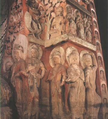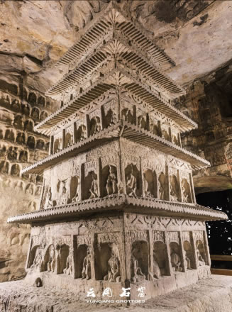 洞窟內三級方形浮屠塔居中,塔面上刻出瓦筒、檐椽、斗拱等仿木建筑構件,層層瓦壟出檐,上層四角鏤空雕刻八角棱柱,形成了周匝回廊,為研究北魏建筑提供了實物依。