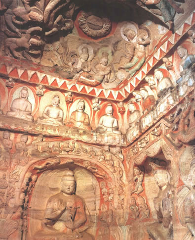 據初步統計,第15窟現存千佛造像達13200余尊,加上其他各類造像,總數達13600余軀,占到云岡石窟現存59000余各類人物造像的23%強。整個洞窟集中表達了三世十方皆為佛國、平等眾生皆可成佛的大乘佛教時空觀念,這無疑是云岡石窟走向成熟時代的偉大創(chuàng)作。