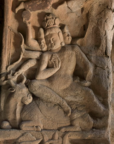 窟門拱頂正中雕一朵團蓮,四周飛天起舞。內側上拱邊框為連續(xù)排列的忍冬葉,周圍雕伎樂天人。拱內側壁分為上下層,下層為天王門神,逆發(fā)胡人形象,手持金剛杵或三叉戟。上層雕出多頭多臂神像,東壁雕三頭四臂,西壁雕三頭六臂。