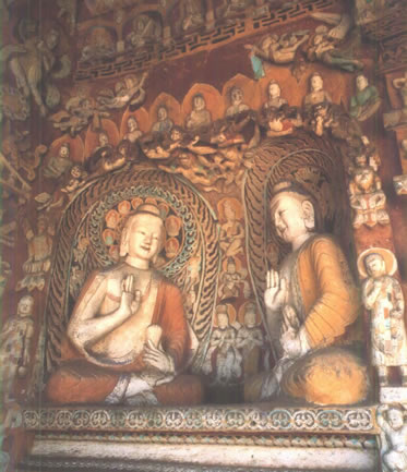 后室北壁頂部三角紋帶雕刻之下有上、下兩層大龕,下龕為圓拱龕,高4米,龕內雕坐佛。上龕為盝形帷幕龕,龕內中央為倚坐佛,兩側各有一交腳菩薩,最外兩側為思惟菩薩。龕楣十二格內各雕一身飛天,龕楣上方雕有十四身伎樂天。