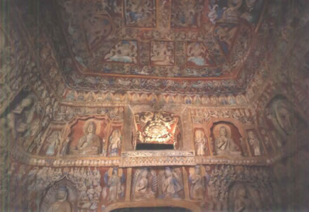 窟頂為中央團蓮,四角斜枋平棊,四面的等腰梯形內,各雕雙龍纏繞,為八大龍王。四壁上部清一色的單佛小龕,成千上萬,縱橫交織,整齊劃一,交壁小龕內偶有二佛出現。然北壁上部的千佛叢中,雕鑿出云岡中期常見的彌勒與釋迦、多寶組成的三世佛主題:上方是二柱式盝形龕,可惜龕中的彌勒像風化殆盡,兩側稍間的菩薩像僅見立姿;下方是二佛并坐圓拱大龕,龕中的釋迦、多寶外形剝殘。