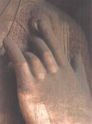 露天大佛高約13.7米,端坐于石臺座之上。佛首磨光肉髻,方圓面相,廣額豐頤,眉眼細長,鼻梁挺直,大耳垂肩;眉間施白毫,嘴唇略薄,唇上、下巴有八字胡須。眼中瞳孔為琉璃鑲嵌,大約是在遼代安裝。佛身挺拔壯碩,兩肩寬厚,著袒右肩式袈裟。袈裟質地厚重,衣褶自然流暢,具有犍陀羅造像遺風。大佛內衣輕薄貼體,整體疏密得當,雕刻工藝精湛。大佛神情莊嚴,慈祥泰然,結跏趺坐,雙手于腹間相會疊加,呈禪定手印?上植颗c雙腿風雨侵蝕,雕飾全無。但是大佛姿態(tài)雄偉,氣宇軒昂,生氣勃勃,融合東西方雕塑藝術于一體,是兼?zhèn)淞朔鹜印叭、八十種隨形好”的造像珍品。
