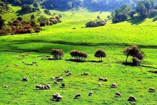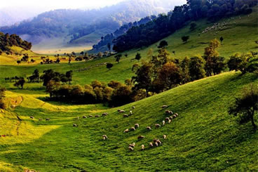 群山競秀,溪壑密布,林木參天,草場綿延不絕。森林沿圓潤柔和的山體從上到下呈放射狀分布,與廣闊肥腴的草原相間,形成了獨(dú)特的地理形態(tài)。組成草原的山巒重重疊疊,蜿蜒起伏,和舒緩寬闊的山谷坡地密切銜接,延綿不斷。幽澗水澤穿行于腹地,或囤積成片分布在大大小小的草坡上,或森林間,使得草原地面表層常年濕潤無比。春秋季節(jié),游人絡(luò)繹不絕的蜂擁而至,踩在青翠碧綠的草面上,常會為被地表的柔軟和從鞋子周圍緩緩溢出的水感到驚訝。由于受垂直地帶性地理?xiàng)l件的影響,終年氣溫較低,春秋相連,冬長無夏,素有“關(guān)山六月猶凝霜”的寫照。因其地貌酷似中歐的阿爾卑斯山,故有些旅游資料上稱其是“具有歐式風(fēng)情的游覽勝地”。