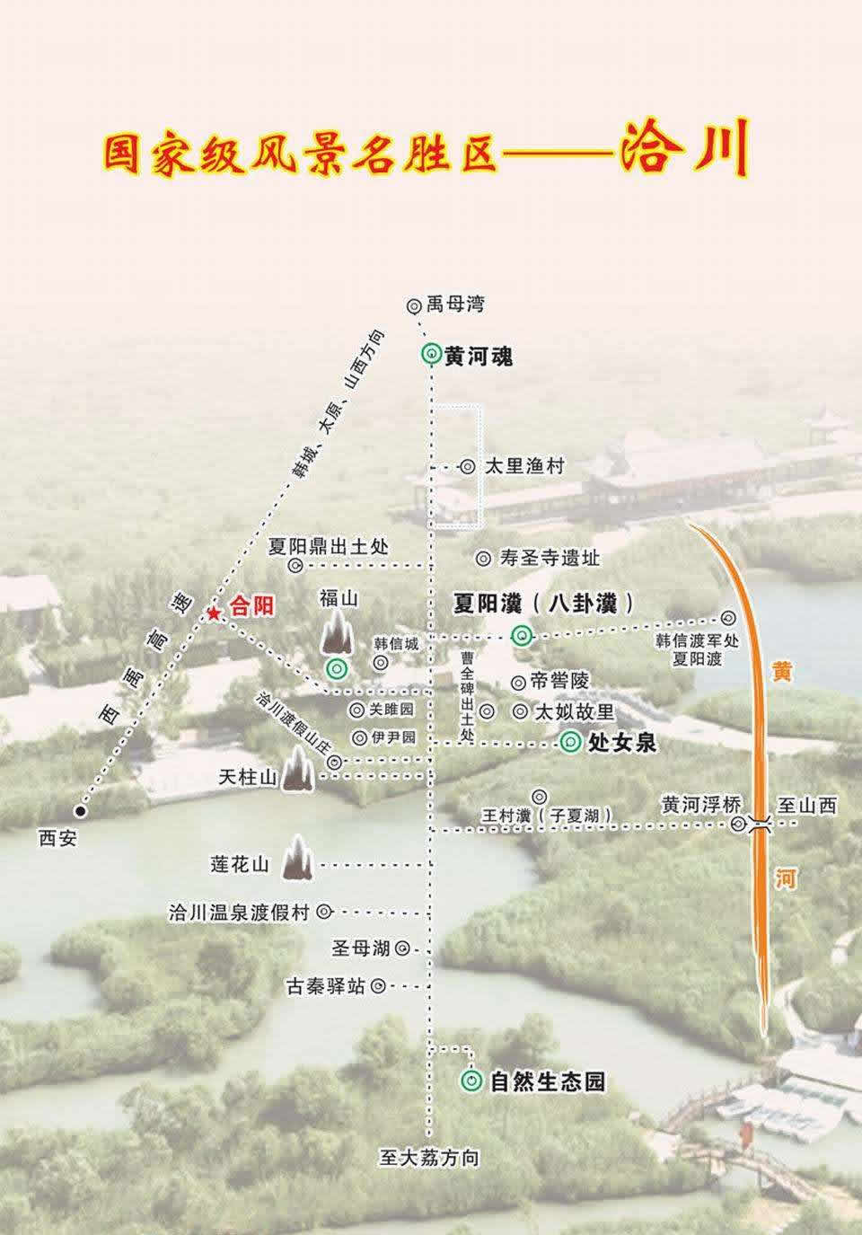 1995年經(jīng)陜西省政府批準(zhǔn)設(shè)立的洽川風(fēng)景名勝區(qū),2004年被列為國(guó)家級(jí)風(fēng)景名勝區(qū),堪稱(chēng)中華一絕。景區(qū)位于縣城以東20公里的黃河西岸,面積176平方公里。景區(qū)內(nèi)有黃河流域最大的蘆葦蕩(10萬(wàn)畝)和最大的濕地保護(hù)區(qū)(15萬(wàn)畝),白天鵝、丹頂鶴、黑鸛、大鴇等百余種國(guó)家一、二級(jí)保護(hù)動(dòng)物在此棲息。景區(qū)的7處瀵泉天下獨(dú)有,其中"處女泉"最為神奇,人入水不沉,泉涌沙動(dòng),如綢佛身,如沙浪浴,是名符其實(shí)的"華夏一絕"。"萬(wàn)畝蘆蕩,千眼神泉,百種珍禽,十里荷塘,一條黃河,秦晉相望",是洽川風(fēng)景名勝區(qū)的真實(shí)寫(xiě)照。觀洽川景,游處女泉,住農(nóng)家院,享農(nóng)家樂(lè),擁抱母親河已成國(guó)內(nèi)外游客的神往。