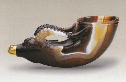 酒器,長15.5厘米,口徑5.9厘米。鑲金獸首瑪瑙杯選材精良,巧妙利用玉料的俏色紋理雕琢而成。杯體為角狀獸首形,獸雙角為杯柄。嘴部鑲金帽,眼、耳、鼻皆刻劃細微精確。從選材、設計到工藝,都可稱為唐代玉雕藝術的精品,是迄今發(fā)現(xiàn)唐代唯一一件俏色玉雕,是唐代玉器做工最精湛的一件,也是唐代中外文化交流的產物。