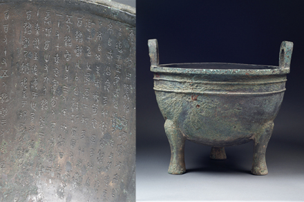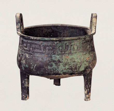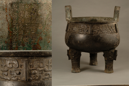 鑄于周康王時期,造型敦厚雄偉,紋飾莊重神奇。通高77厘米,口徑56.5厘米。立耳,深腹,平沿方唇,三柱足?谘叵嘛椄〉駹铟吟鸭y,地襯細雷紋。三足根部飾大饕餮面。雙耳外側各飾一條曲體上緣的夔龍。腹外壁及底部厚積煙跡,顯系長期使用所致。腹內壁鑄有銘文28字。旟鼎承襲商代圓鼎風格,造型厚重莊嚴,紋飾十分精美,所刻銘文是研究周初土地制度的重要史料,具有珍貴的歷史及藝術價值,加之鑄刻時代明確,被公認為周康王時的標準器,是一尊著名的西周時期的國寶。