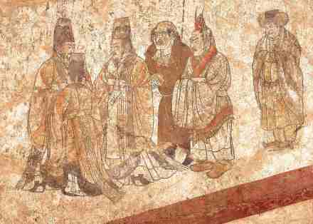 高185厘米,寬247厘米。繪于章懷太子墓道東壁。畫面中共有六位人物,前三位是唐朝鴻臚寺官員,均著初唐朝服,頭戴籠冠,身穿闊袖紅袍,白裙曳地,腰系綬帶,手持笏板,足登朝天履,呈三角狀站立。三人氣度沉穩(wěn),雍容自如,神情肅穆,面面相對,似乎正在商討事宜。后面三位,為首一人推斷應是來自東羅馬的使節(jié)。中間一人推斷是來自朝鮮半島的新羅使節(jié)。最后一位應來自中國東北靺鞨族。這三位使者均躬身,畢恭畢敬,謙卑的神情中流露出期盼、等待之意。