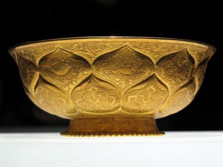 通高5.5厘米,口徑13.7厘米,足徑6.7厘米。錘擊成型,侈口,圓唇,鼓腹,平底,喇叭形圈足。器身滿飾珍珠地紋,腹部捶出雙層仰蓮瓣,上層蓮瓣中分別鏨鴛鴦、鸚鵡、鴻雁、鸛翎、鹿、狐、獐、兔、鴨等珍禽異獸;下層蓮瓣內刻忍冬花草。碗內底刻寶相花。圈足飾方勝紋一周,內刻鼓翼云端的飛鳥一只及流云數(shù)朵,底沿以小聯(lián)珠綴成。碗內壁有墨書重量“九兩三”。制作精妙絕倫,富麗堂皇,典型的唐代藝術風格,充分體現(xiàn)了唐代金銀器裝飾藝術的成熟,是罕見的藝術作品。