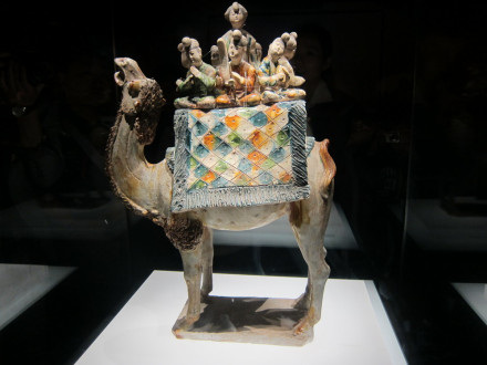 通高58厘米,高24.2厘米,口徑12.4厘米,足徑14.3厘米。典型的盛唐時期的作品,舞樂者均穿著漢族衣冠,使用的卻大都是從西域傳入的樂器,表現(xiàn)的是流行于開元、天寶時期的“胡部新聲”的新舞樂。這組俑以狹小的駝背作舞臺,卻承載陣容龐大的樂隊來表現(xiàn)當時流行的新舞樂,大膽運用了藝術夸張,充滿想象與浪漫。制作工藝精湛,形態(tài)逼真?zhèn)魃,使人仿佛耳聞悠揚的樂曲。釉色鮮明亮麗,協(xié)調自然,堪稱唐三彩中的極品。不僅具有很高的藝術欣賞價值,對研究盛唐時期的音樂、歌舞以及中外文化交流也具有重要的參考價值。