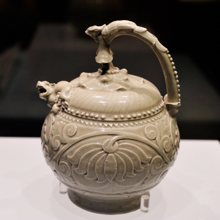 這件提梁倒灌壺是著名的耀州窯(窯址在今陜西省銅川市王益區(qū)黃堡鎮(zhèn))產品。耀州窯是唐宋時中國北方名窯,時人推崇耀瓷“巧如范金,精比琢玉”。此壺造型古樸典雅,制作規(guī)整精細,紋紋繁褥華麗,尤其是構思奇特,設計巧奪天工,被認為是國內外存世耀州窯瓷器中最為精美的一件。
