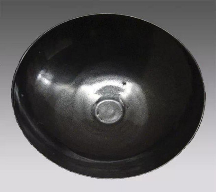 高9厘米、口徑30.2厘米、足徑11.8厘米。碗大口小足,胎質灰白,通體施黑釉。油層表面布滿了大小不一,稱金屬光澤的小圓點,這些圓點就像浮在水面上的油滴一樣,因此被成為”油滴釉“。油滴釉是黒釉中一個特殊的種類,屬于結晶釉。迄今所見的油滴釉器多出自建窯,胎體較厚,器型較小,這件黑釉“油滴”瓷碗,胎體厚重,釉面漆黑。如此之大和如此之美的油滴碗,具有典型的北方窯口的工藝特征,特別是環(huán)布碗底的油滴斑點,晶瑩透亮,增添迷人的色彩,堪稱瓷中珍品。是迄今所見同類器物中體量最大的一件。